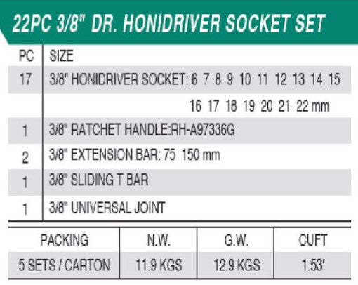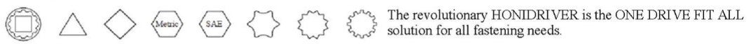 ● The HONIDRIVER system fits Metric 6pt, Metric 12pt, SAE 6pt, SAE 12pt, E-TORX, Spline, Square & 50% rounded off nuts & bolts.