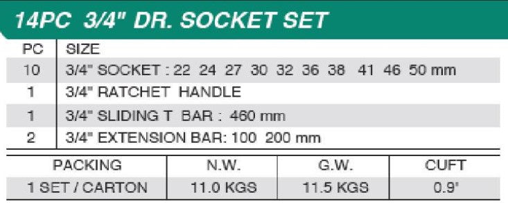 Honiton Socket Set 3/4" Square Drive 22-50mm 14pcs