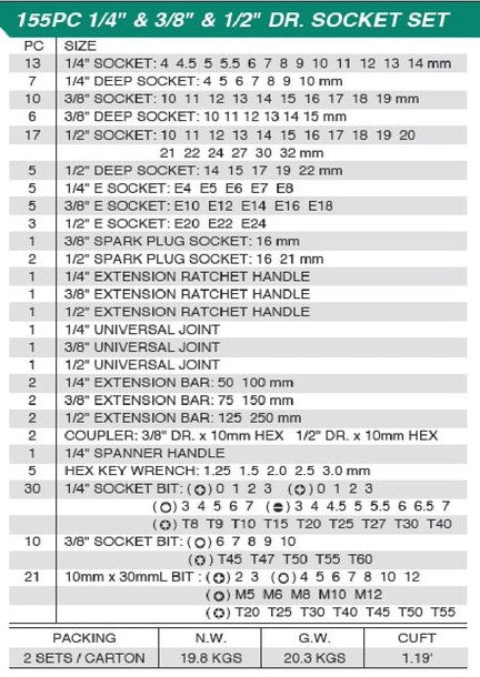 Honiton Socket Set 1/4" 3/8" 1/2" Square Drive 155pcs