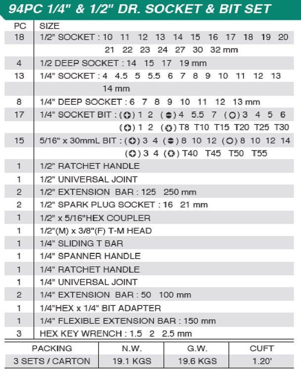 Honiton Socket Set 1/4" 1/2" Square Drive 94pcs