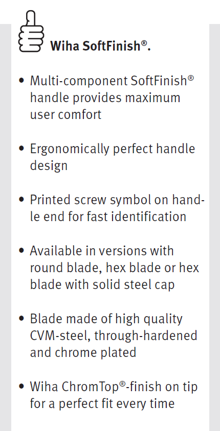 Handle: Ergonomic Wiha SoftFinish® multi-component handle with roll-off protection.
