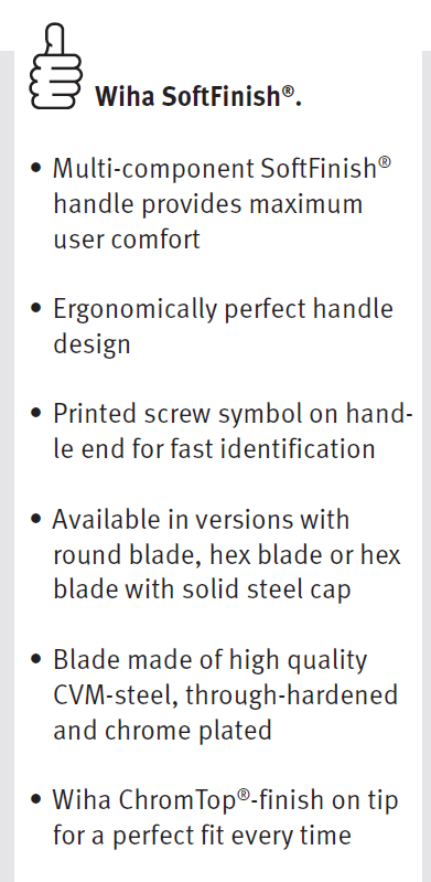 Handle: Ergonomic Wiha SoftFinish® multi-component handle with roll-off protection.