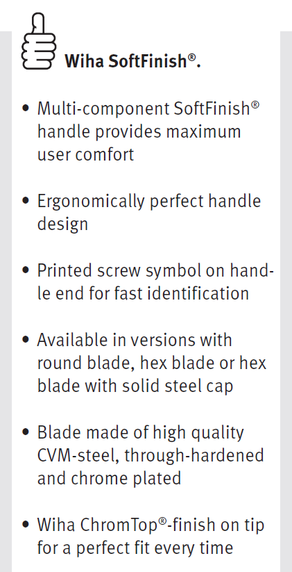Handle: Ergonomic Wiha SoftFinish® multi-component handle with roll-off protection.